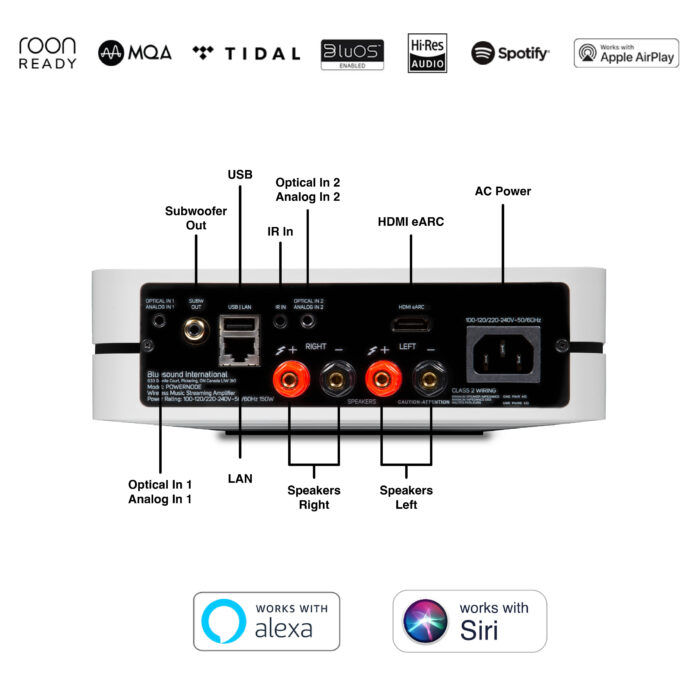 The Bluesound POWERNODE is the HiFi amp reinvented for the streaming age, combining audiophile-grade componentry and multi-room music capabilities to create an intuitive “just add speakers” hi-res sound system for modern music lovers. The compact minimalist exterior disguises 2 x 80 watts of award-winning HiFi amplification, a premium hi-res DAC design, and access to all the music ever recorded with a tap in our BluOS Controller app for smart devices and laptops. Easily drive your existing pair of premium speakers. 80 Watts per channel of HybridDigital™ amplification technology A state of the art Quad-Core 1.8GHz ARM® Cortex™ A53 processor and a 32-bit/384khz premium DAC design ensure flawless playback with precision and clarity. HDMI (ARC & eARC) connectivity. Featuring digital, optical and analog input options, wired and wireless headphone and subwoofer outputs. Wireless Dolby® surround sound. Dual band Wi-Fi, Gigabit Ethernet and support for 2-way Bluetooth aptX™ HD Bluetooth ensures music playback without interruption. Hi-res audio streaming with access to Internet radio stations, cloud music services, and your own local music library to multiple Bluesound Players. Create and control a seamless multi-room system with the intuitive BluOS Controller app. Top panel touch controls with presets. IR input and remote learning capability – Control it with the optional Bluesound RC1 Remote Controller. Connect with the BluVoice skill in the Alexa app and use Amazon’s Alexa voice assistant to control Players around the home. AirPlay 2 lets you play music or podcasts from wireless stereo components throughout your house — all in sync.